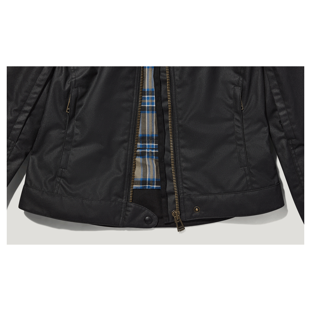 Made from British Millerain 8oz. technical waxed cotton with a breathable waterproof membrane, our women’s Bamburgh motorcycle jacket has D3O shoulder and elbow armour and an internal pocket for optional back protection. Twin needle top-stitching and an oil-resistant corduroy collar and cuffs are durable and an unwaxed cotton internal facing protects clothes. Underarm air vents will keep you fresh while the zip shield and rain gutter will help repel the elements as a silicone central snap protects your tank. The design is finished with a classic logo arm patch, internal trouser loops, adjustable waist and check cotton lining.