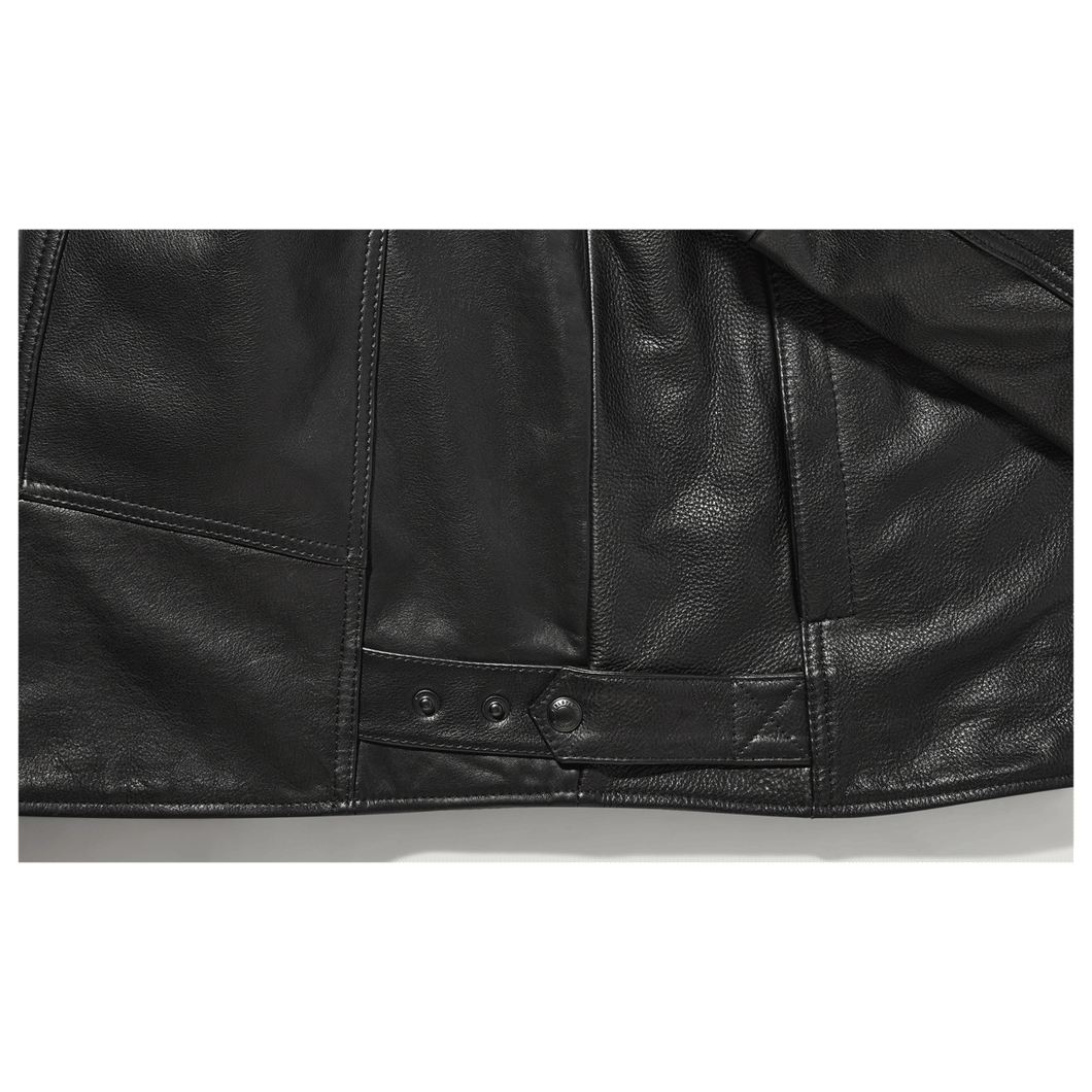 The Broughton motorcycle jacket is crafted from calf leather with natural wax coating, complete with D3O shoulder and elbow armour and an internal pocket for optional back protection. A kidney-shaped back panel and stud throat fastening keep out the wind with stud side-adjusters for a great fit. Oil-resistant neck and cuff facings are hard-wearing, and the rubberised stud waist closure protects paintwork. A leather embossed logo arm patch, engraved hardware and Belstaff signature stitched shoulders complete the look.