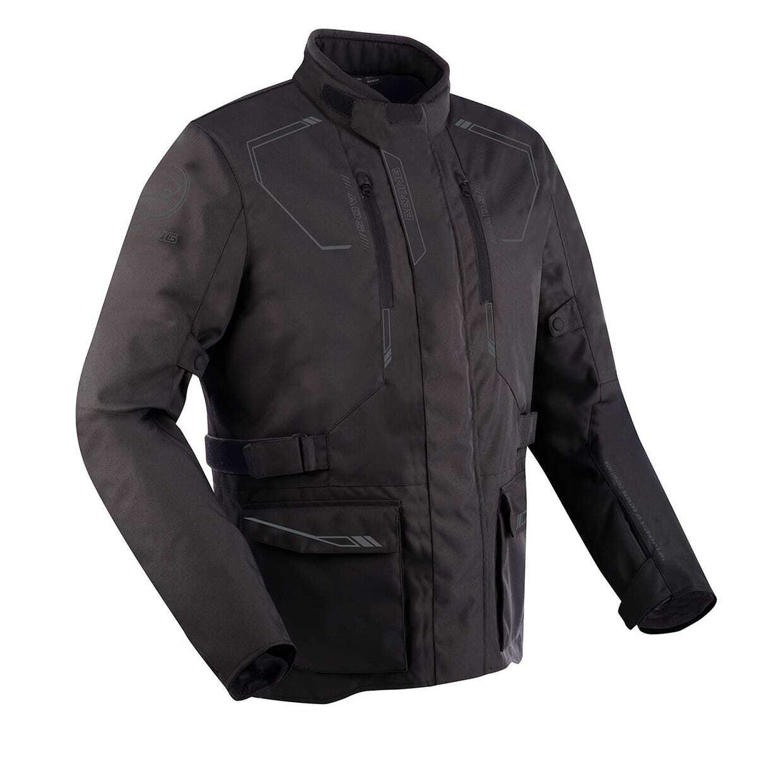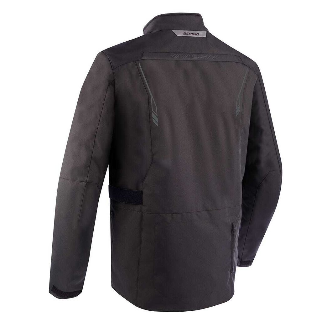 Bering Voyager Jacket Black. Touring style motorcycle jacket made of Fibretech 600D with high abrasion resistance. It has the BW2 Tech Classic waterproof membrane to stay dry in case of rain. It incorporates Omega level 1 protections on elbows and shoulders and a pocket on the back to add the back protector. The ADS ventilation system regulates the flow of internal air through different zippers located on the chest and back.