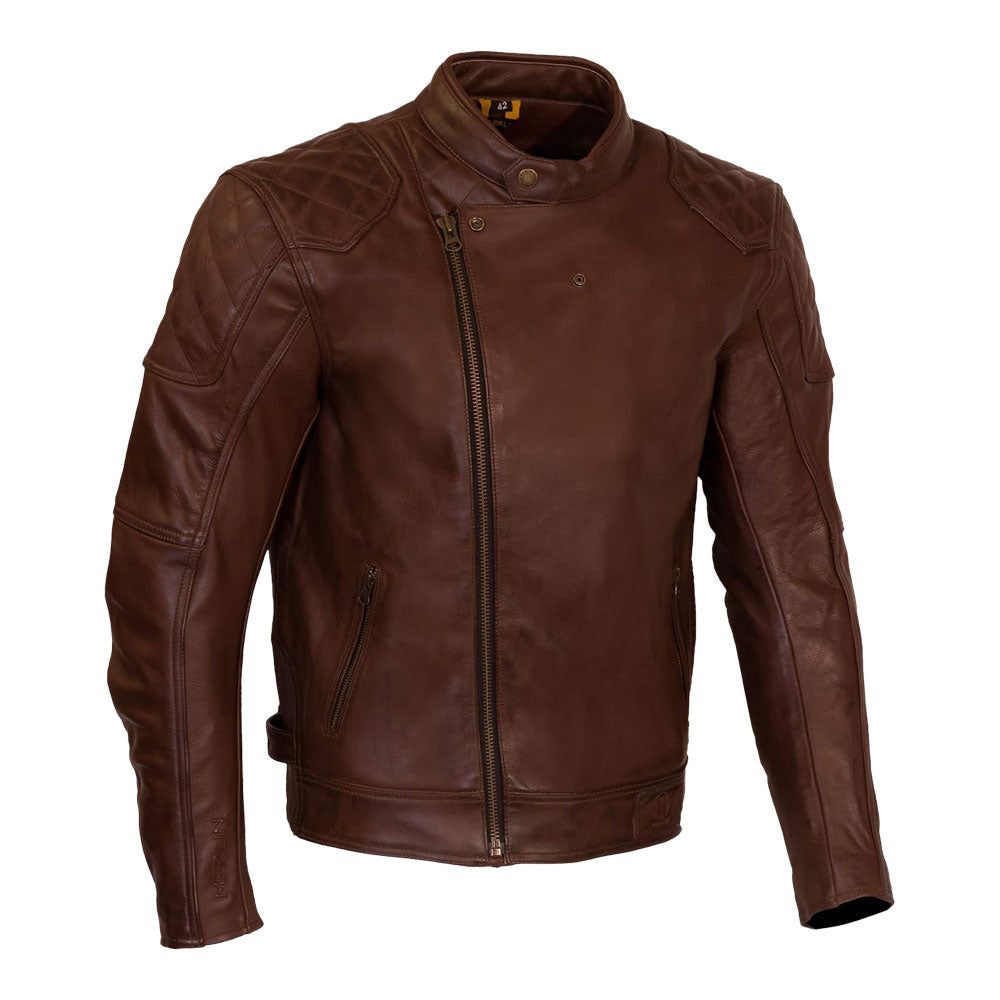 With an asymmetrical front zipper, Chester is a British motorcycle classic. Using a premium cowhide and D3O® four-piece impact protectors, the Chester jacket has thoroughly modern protection in a vintage package. There are three colour options, black, distressed brown and a distressed green for a true signature statement. Each colour comes with antique brass hardware in the Merlin branded snaps, YKK® zippers and metal buckle adjustments. Chester has a supple and luxurious feel, enhanced by the diamond stitched quilt overlays.